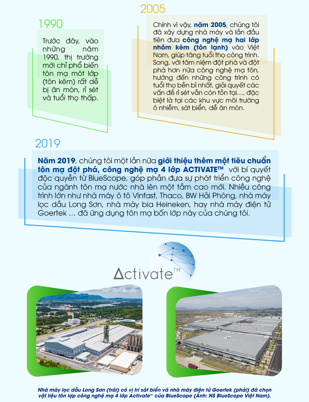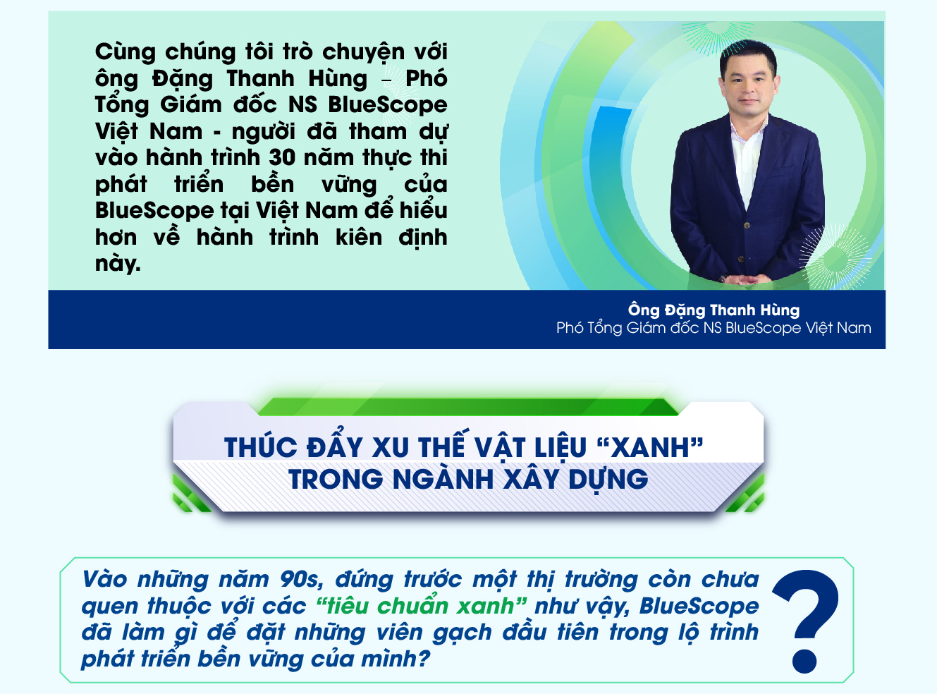 Là doanh nghiệp hoạt động ở cả 3 lĩnh vực trên thị trường quốc tế và lĩnh vực trung nguồn tại Việt Nam, ngay từ khi đặt chân vào thị trường Việt Nam trong bối cảnh các nhà cung cấp trong nước còn lạ lẫm với nguyên liệu bền vững, thị trường chưa phổ biến các tiêu chuẩn về xây dựng xanh, NS BlueScope Việt Nam đã không ngừng định vị bản thân là một nhà sản xuất thép mạ bền vững – một hướng đi không phải ai cũng dám thử sức. Mang trong mình di sản được tích luỹ hơn 100 năm của Tập đoàn, hãng quyết tâm sẽ từng bước thay đổi thị trường thép mạ của Việt Nam bằng những tiêu chuẩn cao hơn, bền vững hơn.