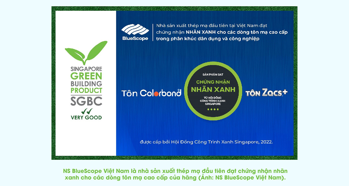 Chúng tôi cũng là nhà sản xuất thép mạ đầu tiên và duy nhất tại Việt Nam được Hội đồng công trình xanh Singapore (SGBC) cấp giấy chứng nhận “Nhãn xanh” Và cũng xin chia sẻ là trong nửa cuối năm 2023, chúng tôi kỳ vọng sẽ được cấp chứng nhận nhà sản xuất thép có trách nhiệm ResponsibleSteel™. Đây không chỉ là dấu ấn đặc biệt cho 30 năm không ngừng hướng ngành tôn mạ phát triển theo các tiêu chuẩn bền vững hơn của chúng tôi mà còn là “tấm giấy chứng nhận” cho hành trình phát triển bền vững của chúng tôi tại Việt Nam.