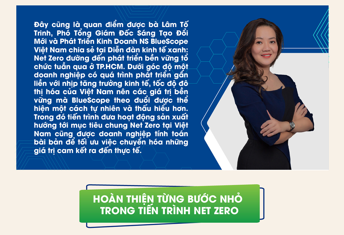 Theo bà Lâm Tố Trinh, đây là thời điểm doanh nghiệp phát huy lợi thế trong việc cung cấp các giải pháp bền vững từ kinh nghiệm của mình. NS BlueScope có lộ trình giảm carbon từ sớm, đi theo con đường chung là ESG. Riêng với Net-Zero, tập đoàn cũng làm việc với các đối tác để họ cùng đi trên con đường giảm phát thải carbon. Kinh nghiệm là chia nhỏ giai đoạn, đầu tư từng phần, sau đó tiến đến quy trình sản xuất, dùng những công nghệ mới hơn, hiện đại hơn để giảm thiểu tiêu thụ năng lượng và nhiên liệu sản xuất.