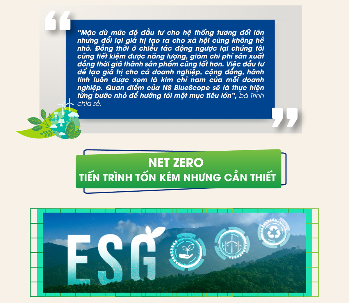 Việt Nam đã bước vào kỷ nguyên mới của toàn cầu hóa, đòi hỏi phải có cách tiếp cận khác để duy trì sức hấp dẫn về kinh doanh quốc tế. Thời điểm này, các doanh nghiệp tập trung vào chuyển đổi kỹ thuật số, hướng tới một con đường chung là ESG để giải quyết các thách thức từ mặt trái của tăng trưởng kinh tế. Với việc cung cấp nền tảng cốt lõi cho hạ tầng ngành xây dựng với hệ sinh thái đối tác rộng, NS BlueScope đang có lợi thế để tiếp cận chiến lược phát triển bền vững hướng tới Net Zero một cách rõ ràng và đồng nhất.