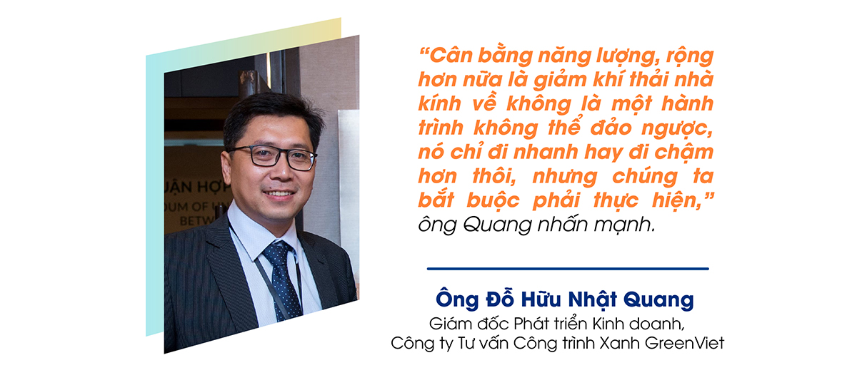 Là một doanh nghiệp tiên phong trong kiến trúc xanh, ông Đỗ Hữu Nhật Quang – Giám đốc Phát triển Kinh doanh, Công ty Tư vấn Công trình Xanh GreenViet chia sẻ Công ty đã áp dụng ngay cân bằng năng lượng vào văn phòng của GreenViet với việc lắp các tấm pin năng lượng mặt trời lên mái văn phòng.