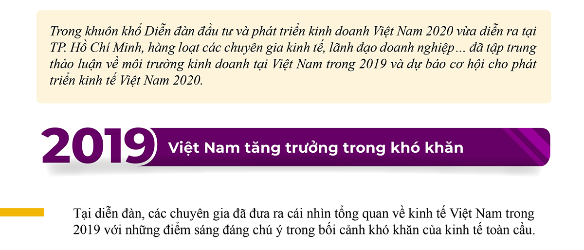 - Chuyên gia kinh tế Võ Trí Thành đưa ra một bức tranh khá hoàn chỉnh trong bối cảnh kinh tế toàn cầu giảm tốc với nhiều biến động khó lường, chỉ tăng trưởng 3% thì kinh tế Việt Nam năm 2019 vẫn có nhiều điểm sáng đáng chú ý như: GDP tăng hơn 7,0% mức tăng cao nhất thế giới và khu vực với động lực chính là công nghiệp chế biến, chế tạo (tăng 11.3%). Vốn đầu tư toàn xã hội thực hiện tăng 10.2% so với 2018 trong đó nổi bật nhất là khu vực kinh tế tư nhân tăng 17.3% chiếm tỷ trọng 46% lớn nhất từ trước tới nay. Vốn đầu tư FDI tiếp tục giữ đà phát triển thực hiện ước đạt 20,4 tỷ USD tăng 6,7%. Xuất khẩu hàng hóa đạt hơn 263 tỷ tăng 8,1% với sự bứt tốc mạnh mẽ của khu vực kinh tế trong nước… Xuất siêu hàng hóa đạt 9 tỷ USD, cao nhất trong 4 năm liên tiếp cán cân thương mại hàng hóa thặng dư.