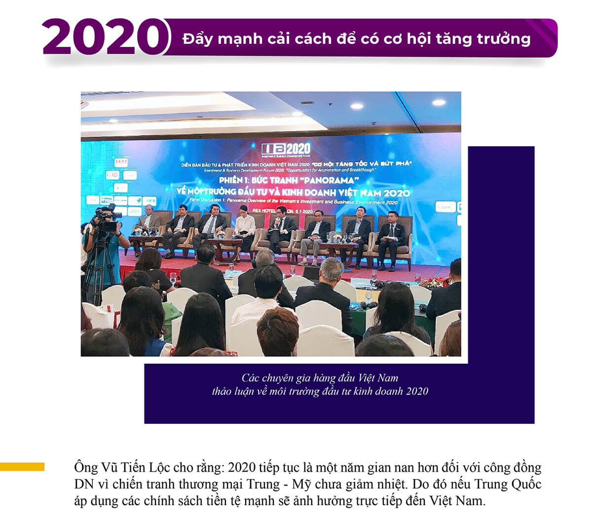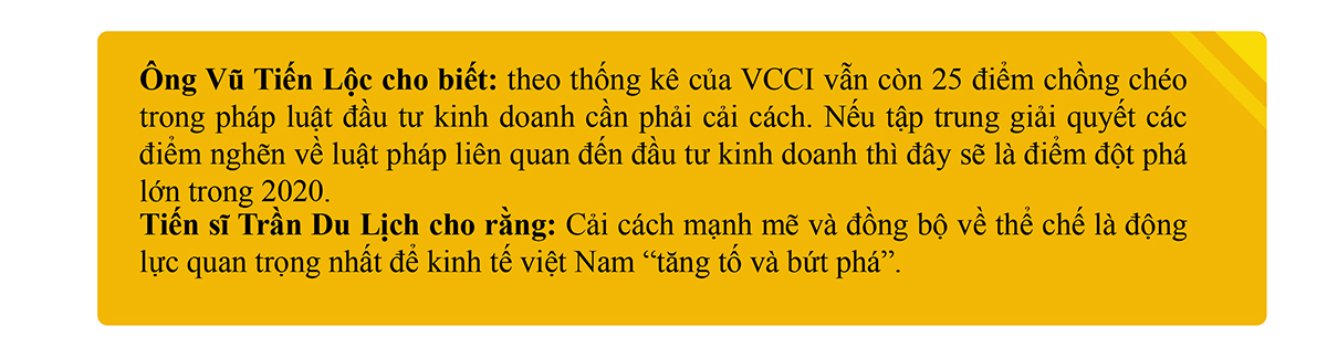 - Đặc biệt theo ông Lộc, vấn đề cải cách thể chế là rất quan trọng trong 2020. Năm 2016, Việt Nam đã thành công khi cắt giảm điều kiện kinh doanh. Tuy nhiên hiện theo thống kê của VCCI vẫn còn 25 điểm chồng chéo trong pháp luật đầu tư kinh doanh cần phải cải cách. Nếu tập trung giải quyết các điểm nghẽn về luật pháp liên quan đến đầu tư kinh doanh thì đây sẽ là điểm đột phá lớn trong 2020.