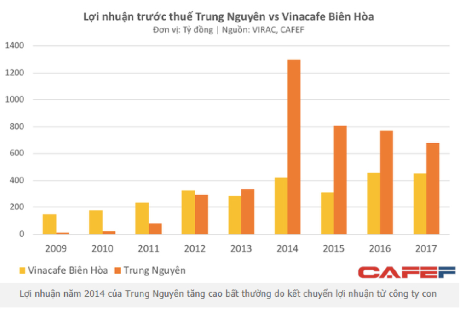 Xét về lợi nhuận, năm 2014, Trung Nguyên ghi nhận 1.300 tỷ đồng lợi nhuận trước thuế – gấp 4 lần so với năm 2013. Năm 2015 bắt đầu mâu thuẫn giữa vợ chồng ông chủ Trung nguyên, và những năm tiếp theo 2016-2017, lợi nhuận của Trung Nguyên tiếp tục suy giảm xuống còn lần lượt là 768 tỷ và 681 tỷ đồng.