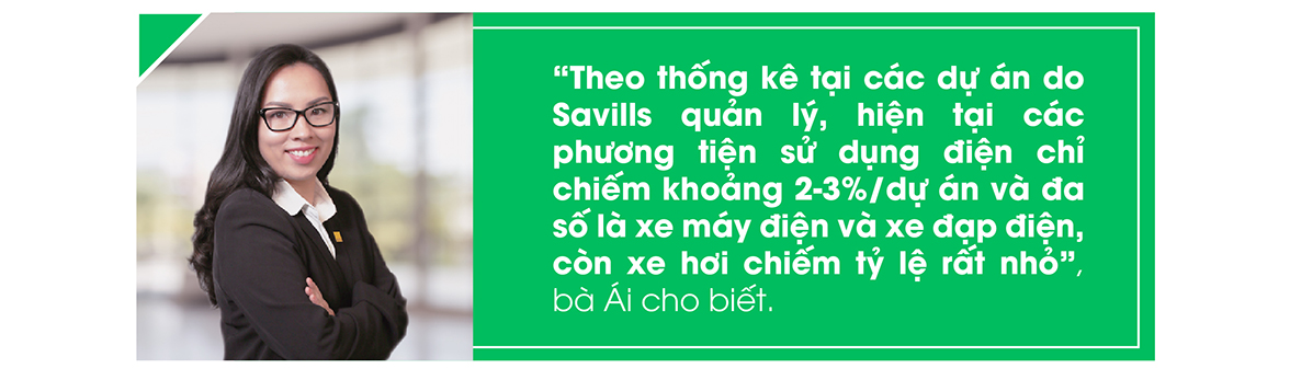 Theo bà Trần Minh Ái, Giám đốc cấp cao, Bộ phận Quản lý bất động sản Savills Việt Nam, mặc dù Việt Nam là quốc gia đi sau trong việc chuyển đổi sang xe điện, song tốc độ tăng trưởng ghi nhận khá nhanh. Tất nhiên, so với tỷ lệ người dân sử dụng phương tiện chạy bằng xăng, dầu, nhóm người dân sử dụng các phương tiện xanh còn rất thấp.