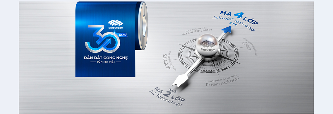 Cách đây 3 năm, BlueScope Việt Nam tiếp tục giới thiệu một tiêu chuẩn mới cho ngành hàng: tôn mạ theo tiêu chuẩn AM (Tôn mạ ma trận 4 lớp – Công nghệ ACTIVATE™ và INOK™). Đây là công nghệ độc quyền có hiệu quả chống ăn mòn tiên tiến nhất thị trường hiện nay.
