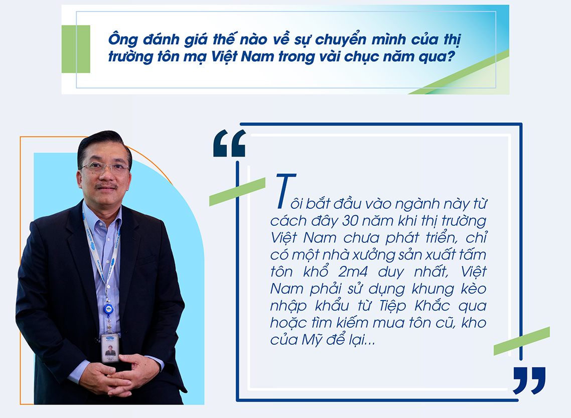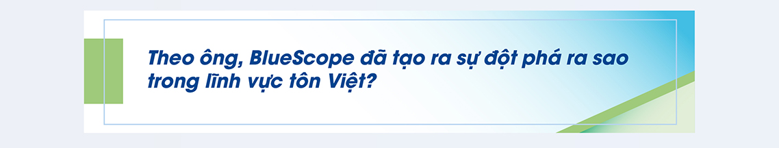 Sự thay đổi của ngành này tại Việt Nam không hoàn toàn đến từ BlueScope. Nhưng cách đây 30 năm khi nhà máy của chúng tôi ở mảng hạ nguồn (Downstream) với thương hiệu BlueScope Lysaght® được vận hành tại Việt Nam đã mang đến “làn gió mới” cho công nghệ sóng tôn lúc bấy giờ với tôn “không vít” Lysaght® Klip-Lok® có liên kết đai kẹp âm, hệ mái có thể tự do di trượt dưới sự giãn nở nhiệt. Giải pháp này đã mở đường cho sự ra đời của các dòng tôn “không vít” sau này, góp phần vào sự phát triển của công nghệ lợp tôn nói riêng và sự phát triển của ngành xây dựng nói chung.