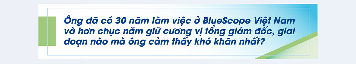 Khó khăn nhất chính là giai đoạn hiện tại, nhu cầu thị trường giảm mạnh, nhiều doanh nghiệp thép đang gặp khó khăn và BlueScope cũng không nằm ngoài con số đó. Có 2 vấn đề cần phải nhìn nhận là về ngắn hạn cần phải vượt qua thử thách thế nào và tiếp tục tăng trưởng như thế nào trong tương lai. Để làm được điều này phải nhìn nhận mình đang gặp vấn đề gì và không được nghĩ mình là số một vì nếu nghĩ vậy sẽ không có “bài học” nào cần phải thay đổi.