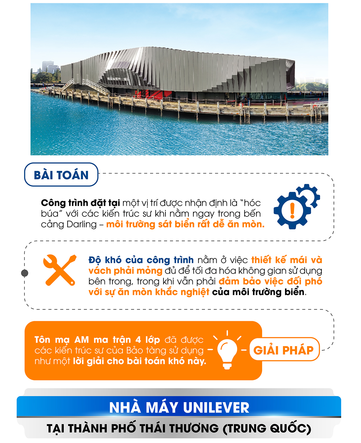 Tại Việt Nam, có thể điểm tên những công trình đang tiên phong sử dụng tôn mạ AM ma trận 4 lớp như nhà máy lắp ráp linh kiện điện tử trị giá 100 triệu USD của Goertek Vina tại Nghệ An, nhà máy SLP, nhà máy Vinfast…