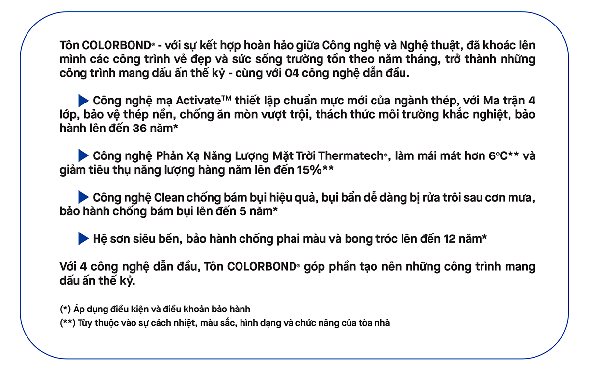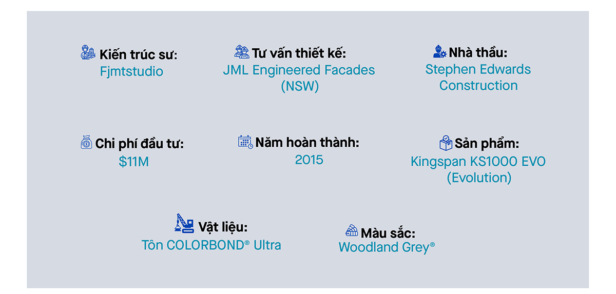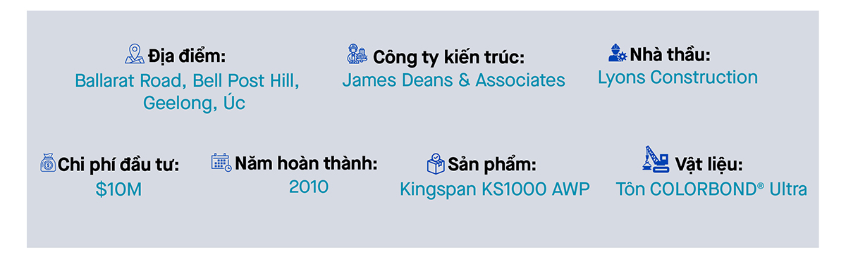 Để đảm bảo các yêu tố trên, tấm panel với vật liệu cao cấp Tôn COLORBOND® theo tiêu chuẩn LPCB & FM được sử dụng cho phần bao phủ của công trình đã giúp các kiến trúc sư thể hiện được thiết kế của mình, đồng thời có khả năng chống chọi với nhiệt độ khắc nghiệt của khí hậu tại Geelong.