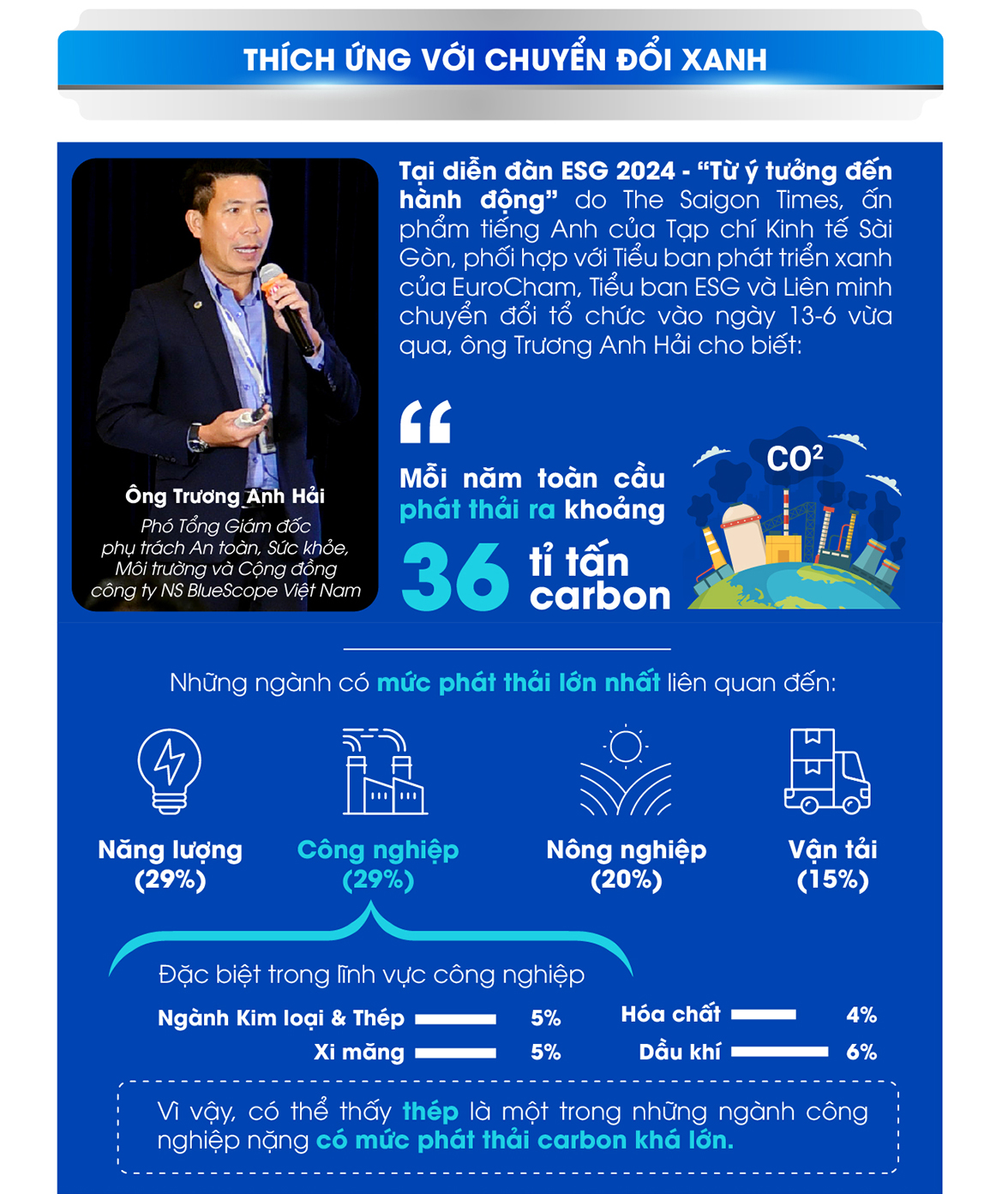 Thép là một trong những ngành có phát thải carbon và tiêu tốn năng lượng khá nhiều. Do đó, các doanh nghiệp trong ngành thép đang nỗ lực chuyển đổi công nghệ sản xuất, thực hiện các giải pháp giảm phát thải; đồng thời đưa ESG vào trong chiến lược kinh doanh để phát triển bền vững, tham gia chuỗi cung ứng toàn cầu.
