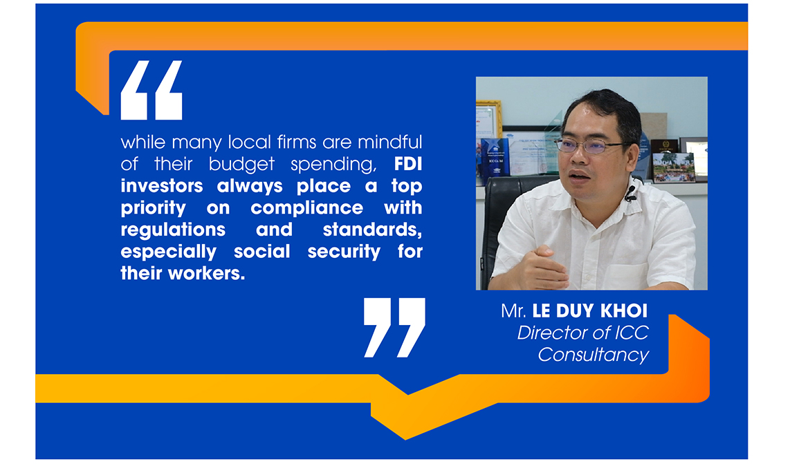 Based on many years of experience in consulting and designing several textile, garment, and footwear factories with hundreds of millions of dollars in scale, Mr. Le Duy Khoi, Director of ICC Consultancy, realized that while many local firms are mindful of their budget spending, FDI investors always place a top priority on compliance with regulations and standards, especially social security for their workers.