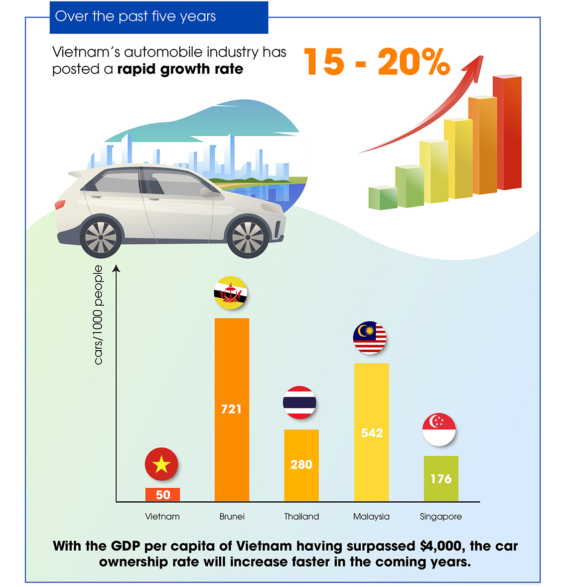Over the past five years, Vietnam’s automobile industry has posted a rapid growth rate of 15 – 20% on average. According to statistics, Vietnam only has about 50 cars per 1,000 people, which is much lower than that of Brunei with 721 cars, Thailand with 280 cars, Malaysia with 542 cars, and Singapore with 176 cars. With the GDP per capita of Vietnam having surpassed $4,000, the car ownership rate will increase faster in the coming years.