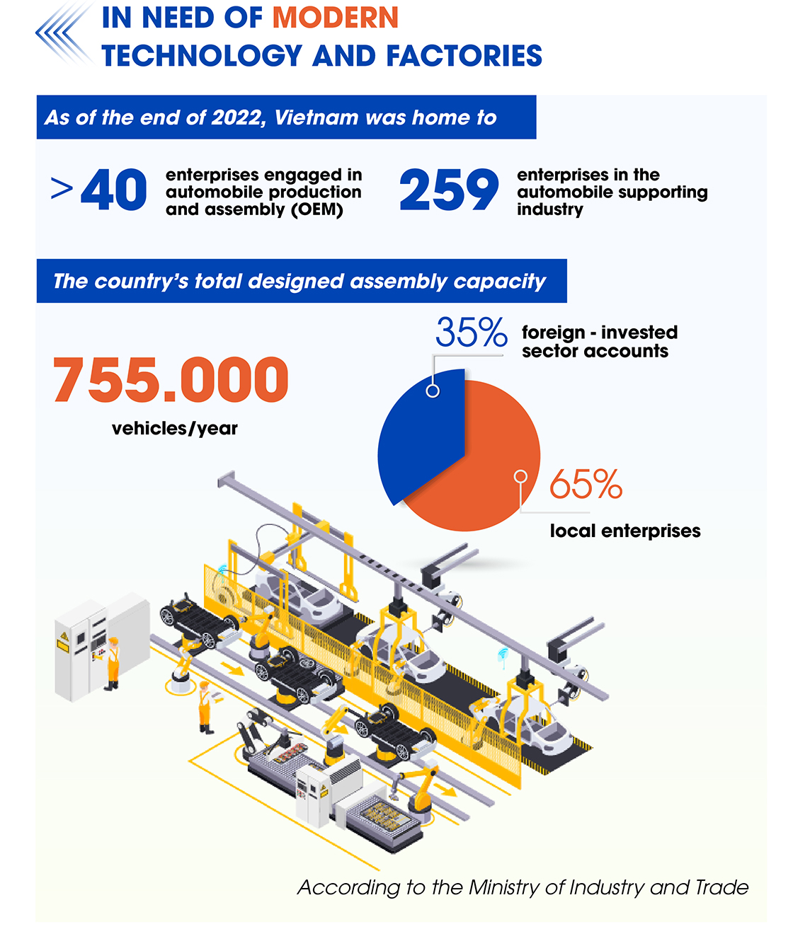 Since 2004, the Ministry of Industry (now the Ministry of Industry and Trade) has issued Decision No. 115/2004/QD-BCN on criteria for automobile manufacturing and assembling enterprises. It stipulates that the factories, production areas, and workshops must have adequate space for the arrangement and implementation of manufacturing, assembly, and testing, as well as other necessary areas for the operation and post-test processing. Manufacturing and assembly areas, covering workshops for painting, welding, and testing, must be arranged according to appropriate technological processes.