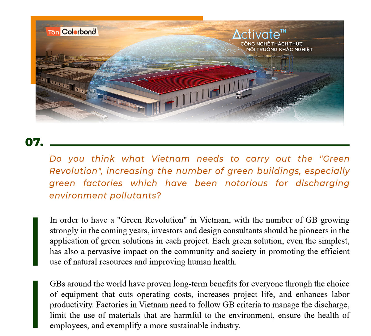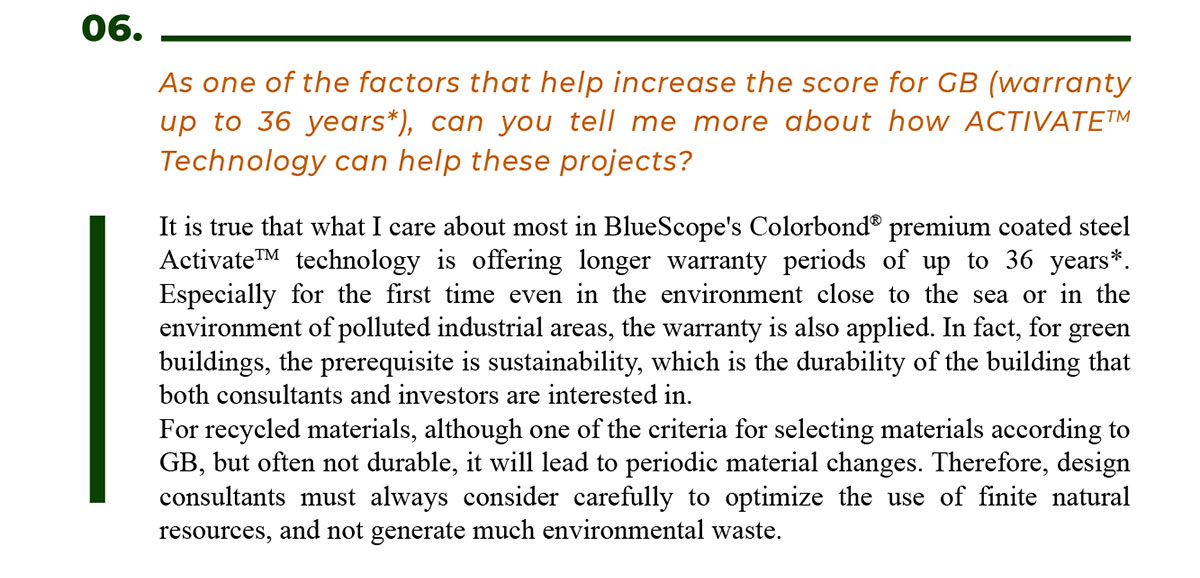 All GB will usually seek out the material type to meet the SRI (heat reflection index) score for the covering and have U-value (insulation coefficient) then paying attention to color, technology or warranty period. For example, why do architect choose Colorbond® premium coated steel of BlueScope? This is mainly because it cools down the temperature and has a better U-value insulation index and color durability. Besides, the new Activate™ technology with micro-structure of 4 phases has superior corrosion resistance at the cutting edge, screw holes and scratches, thus making the roof and corrugated walls more durable. In particular, as far as I know, Activate™ technology can significantly extend the warranty period of products up to 36 years*, which helps the project greatly increase the life expectancy, which is one of the contributing factors that increase the score for GB. This is one of the very important sustainability factors.