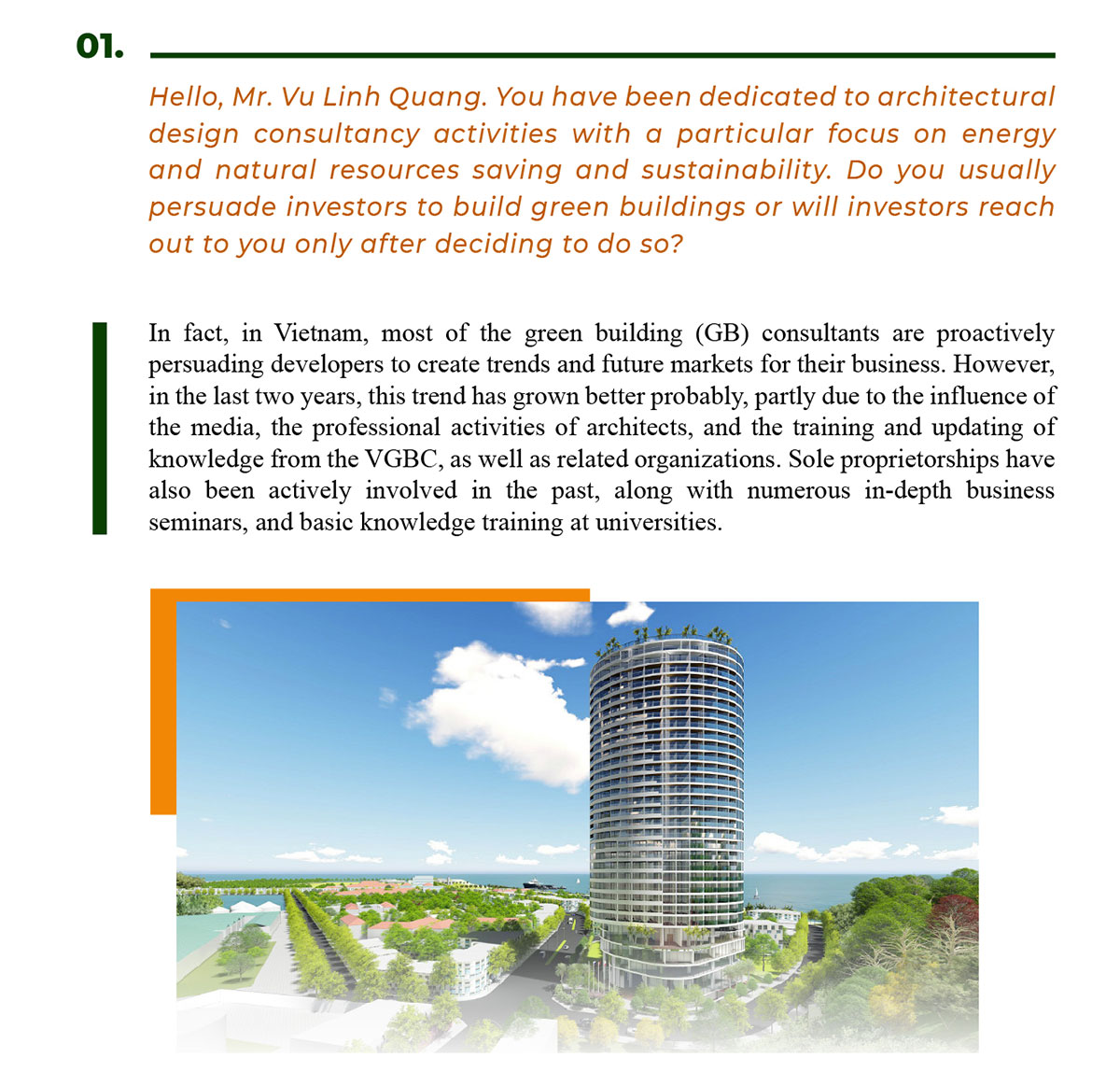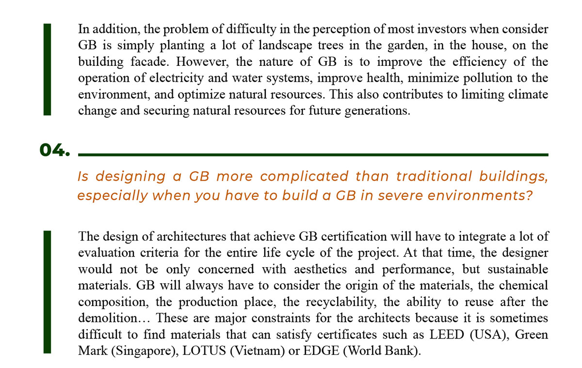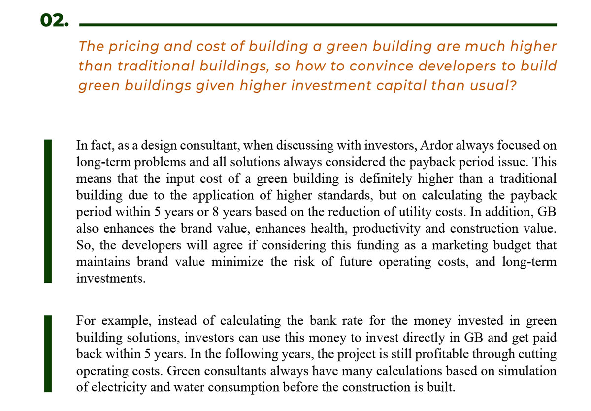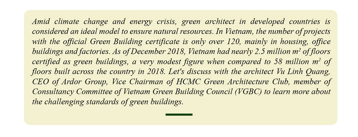 Thus, when the investors reach out to the architects for consultation, they understand the value and lasting benefit of GB. Then architects will advise them with more details, specific evaluation criteria and including cost estimation for GB. However, up to now, the investors who actively build GB often come from projects with a foreign budget because they are obliged to do the environmental protection policy of large international corporations. It is still unpopular for domestic investors to actively consult to implement GB.