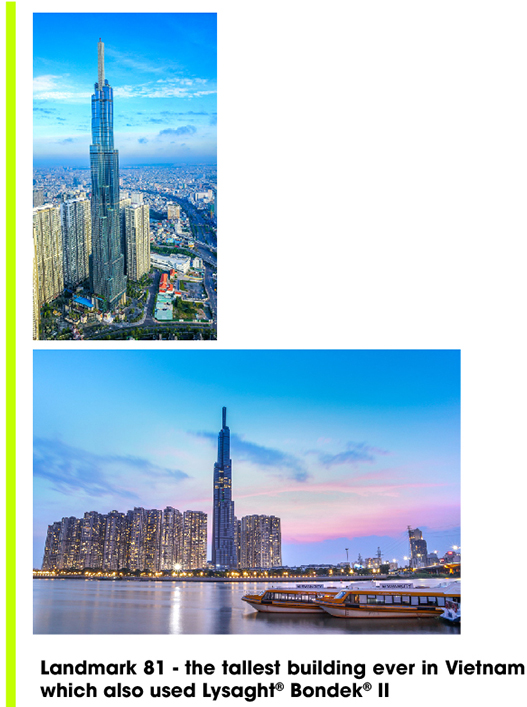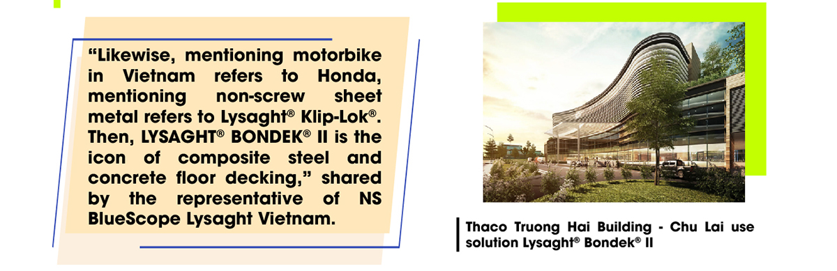 In response to the latest industry trends based on the Company’s in-depth insights of the local market, Ns BlueScope Lysaght has launched LYSAGHT® BONDEK® II since 2017 – the best-of-breed solution from Australian experts – As a viable alternative to traditional formwork and bottom reinforcement steel mesh for concrete slab system. Such solution is not only used for the iconic buildings across the globe as Marina Bay Sand (Singapore), Changi Airport (Singapore), Petronas Twin Tower (Malaysia), One Shelley Street Building (Australia), etc., and is present in notable industrial projects in Vietnam like Thaco Truong Hai factory in Quang Ngai, Long Beach Resort in Phu Quoc, Kizuna Ready Serviced Factory in Long An, Millennium in Quang Ngai and Vietnam’s pride of Landmark 81 – the tallest building ever in the country.