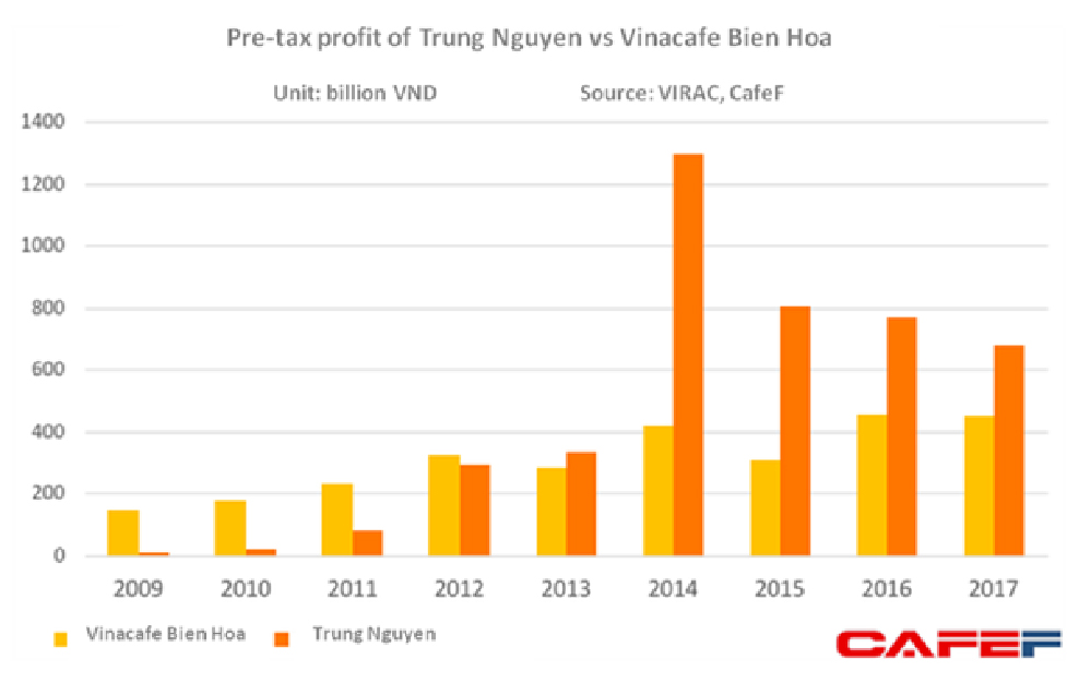 In 2014, Trung Nguyen recorded VND 1,300 billion pre-tax profit, a four-fold increase as compared to 2013. In 2015, conflicts in Trung Nguyen Group started, in the following years of 2016-2017, Trung Nguyen continued to see a decline in profits to VND 768 billion and 681 billion respectively.