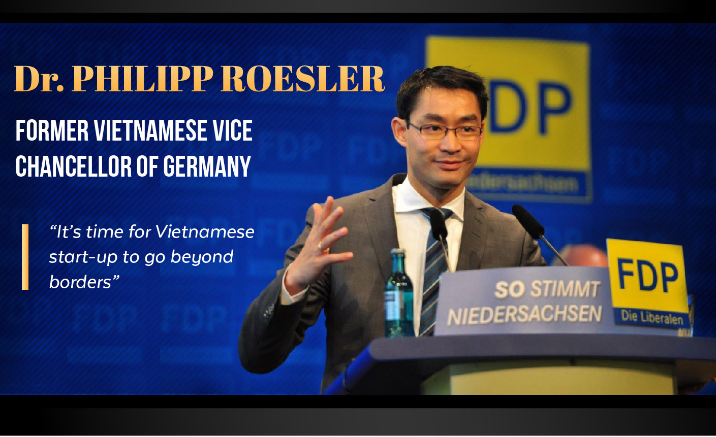 Dr Philipp Roesler was born in Soc Trang province and then adopted by a German soldier’s family at nine months old. He was elected as Federal Minister of Health, then Federal Minister of Economics and Technology (2009-2013) and Vice Chancellor of Germany (2011-2013). Over the last decade, he has enthusiastically taken part in technology activities and development of start-up community. After leaving politics, Dr. Philipp Roesler became a member of the managing board and head of the Center for Regional Strategies of the World Economic Forum (WEF) in Switzerland. During this time, he established a close partnership between WEF and Vietnam, especially focusing on the development of the Industry 4.0 in Vietnam. He said: “On return to Vietnam, I am very pleasant to return to my roots. Apart from getting well-established start-ups in my networks to support Vietnamese start-ups, my vision is also to help Vietnamese start-ups to go beyond borders and thrive together.