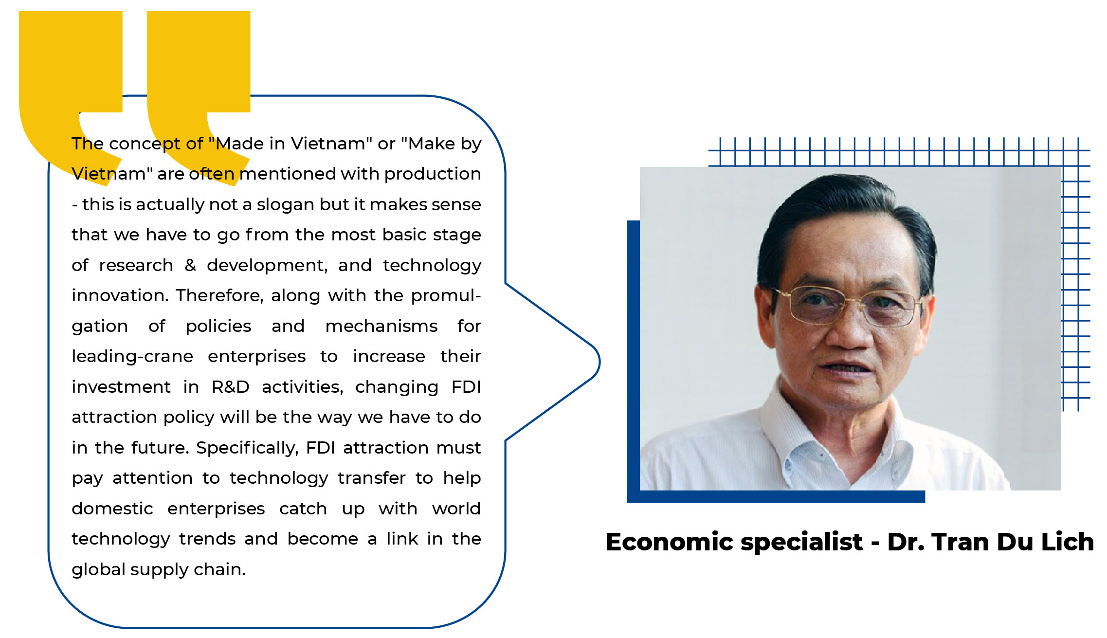 Even the way of FDI attraction also must be changed. We are always proud of having more than 30 years of FDI attraction, but FDI enterprises and domestic enterprises have not had the linkage but developed sporadically. This is what makes us not successful in FDI attraction compared to some other countries. One of the reasons that has not been successful is that the technology transfer to develop domestic enterprises and FDI enterprises has not set a requirement. Here we can tell the story of Samsung Group when they put the majority of their enterprises into outsourcing but few domestic enterprises. There are 3 reasons: