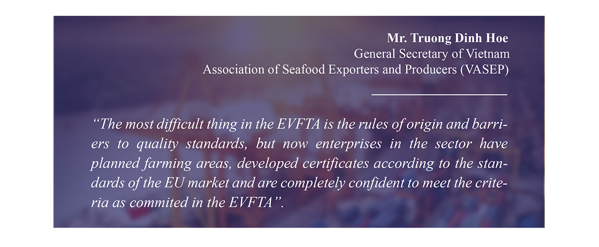 According to Mr. Truong Dinh Hoe – General Secretary of Vietnam Association of Seafood Exporters and Producers(VASEP), this time along with the excitement of the National Assembly’s approving the EVFTA, enterprises in the fishery sector are actively improving necessary standards to take full advantage of this FTA when EVFTA becomes effective.
