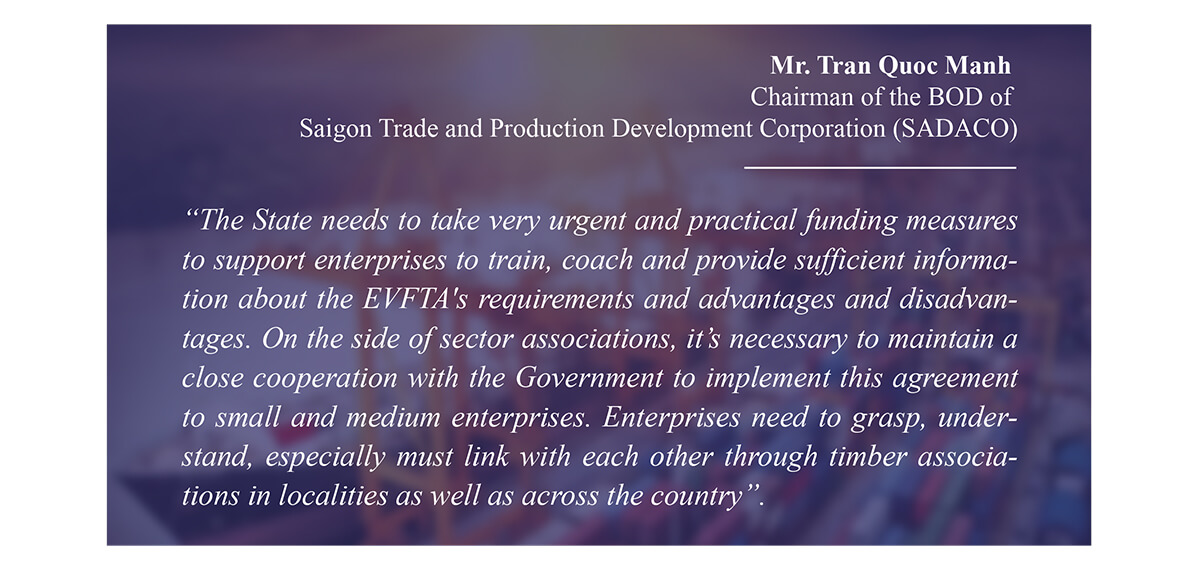 As a company successful in exporting to the EU, Mr. Tran Quoc Manh – Chairman of the Board of Directors of Saigon Trade and Production Development Corporation (SADACO) said that not only SADACO but also many other timber enterprises in Ho Chi Minh City have prepared from raw materials, standard systems, international certification, etc. and updated all information about the EVFTA deployment process, so they are confident meet the contents of the EVFTA. However, in order to maximize the effectiveness of EVFTA, Mr. Manh proposes the involvement of ministries, associations and enterprises.