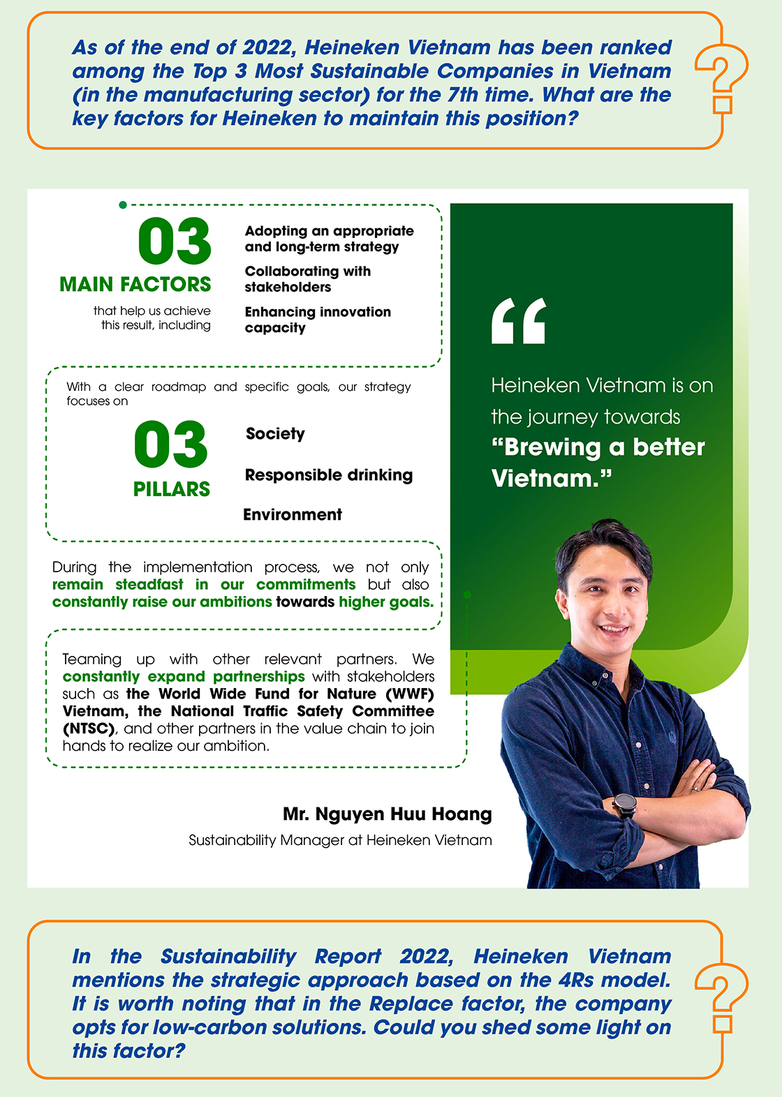 Over the past three years, Heineken Vietnam has rolled out 6 different innovative products, including no- and low-alcohol products. Not only are we creative in the product portfolio, but we also take the lead with unique and pioneering marketing campaigns and activities. We have won the “Marketer of the Year” award at the MMA Smarties Vietnam awards ceremony for two consecutive years, which is a testament to the company’s superiority in comprehending the new generation of consumers.
