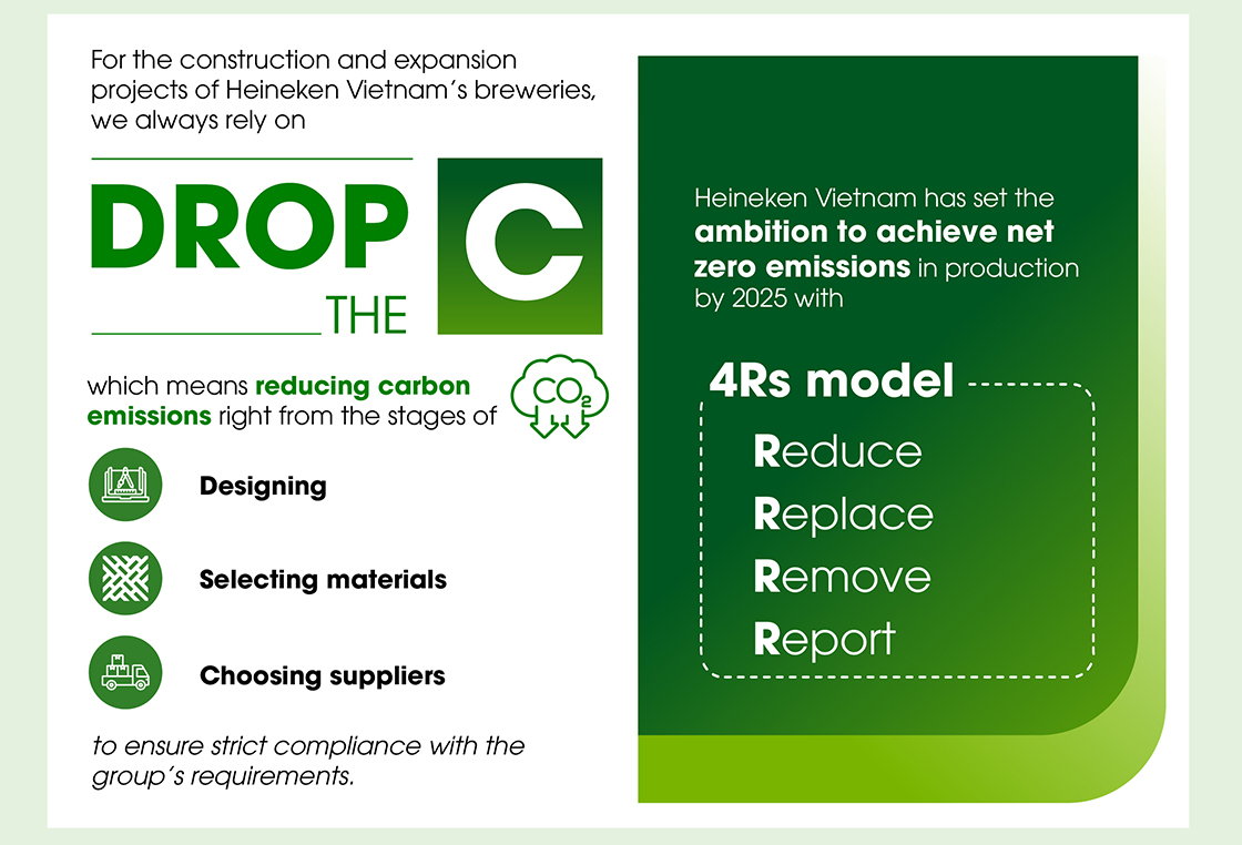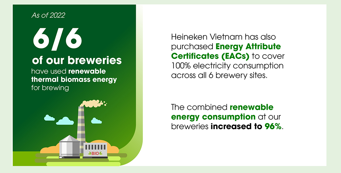 At Heineken Vietnam, we have set the ambition of reaching net zero carbon emissions in production by 2025 with the 4Rs model, including Reduce, Replace, Remove and Report. With regards to the Replace factor, we replace fossil fuels with renewable energy or low-carbon solutions.