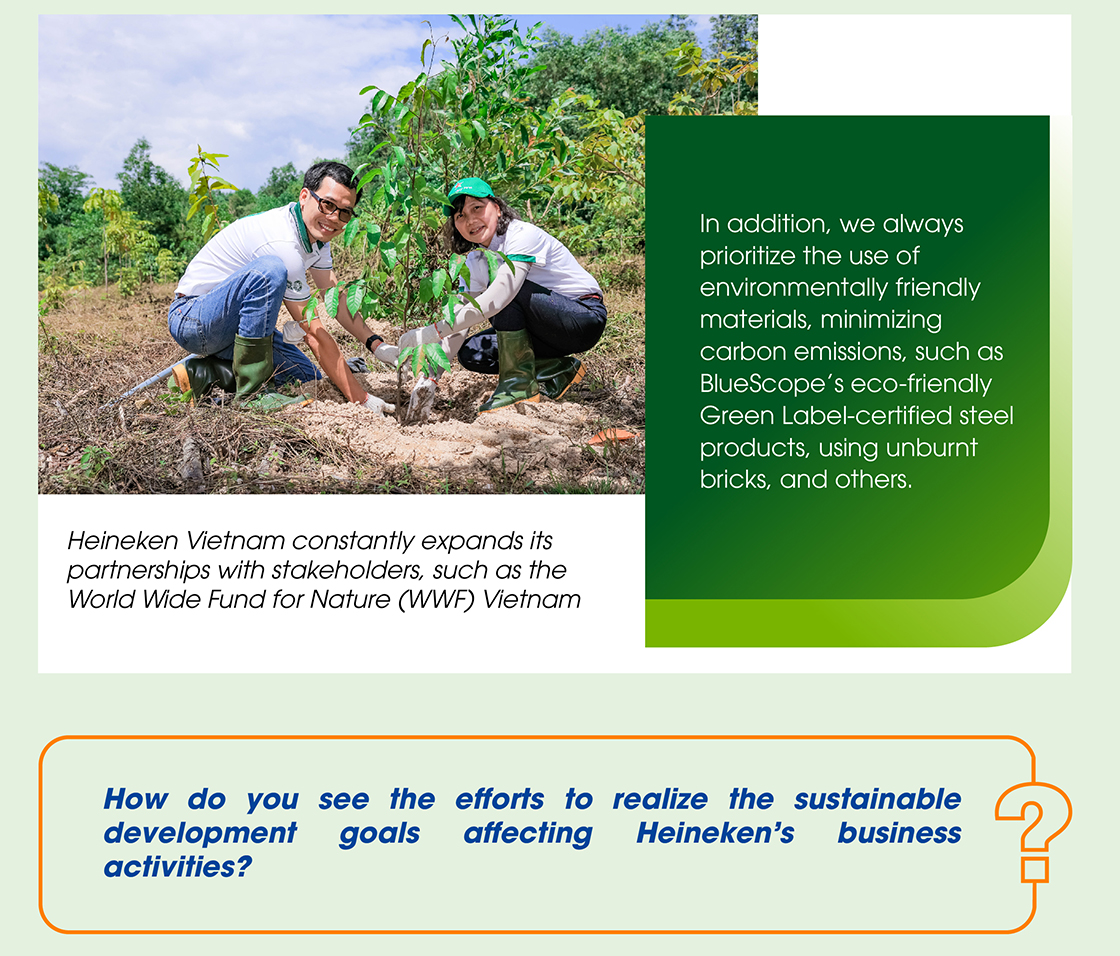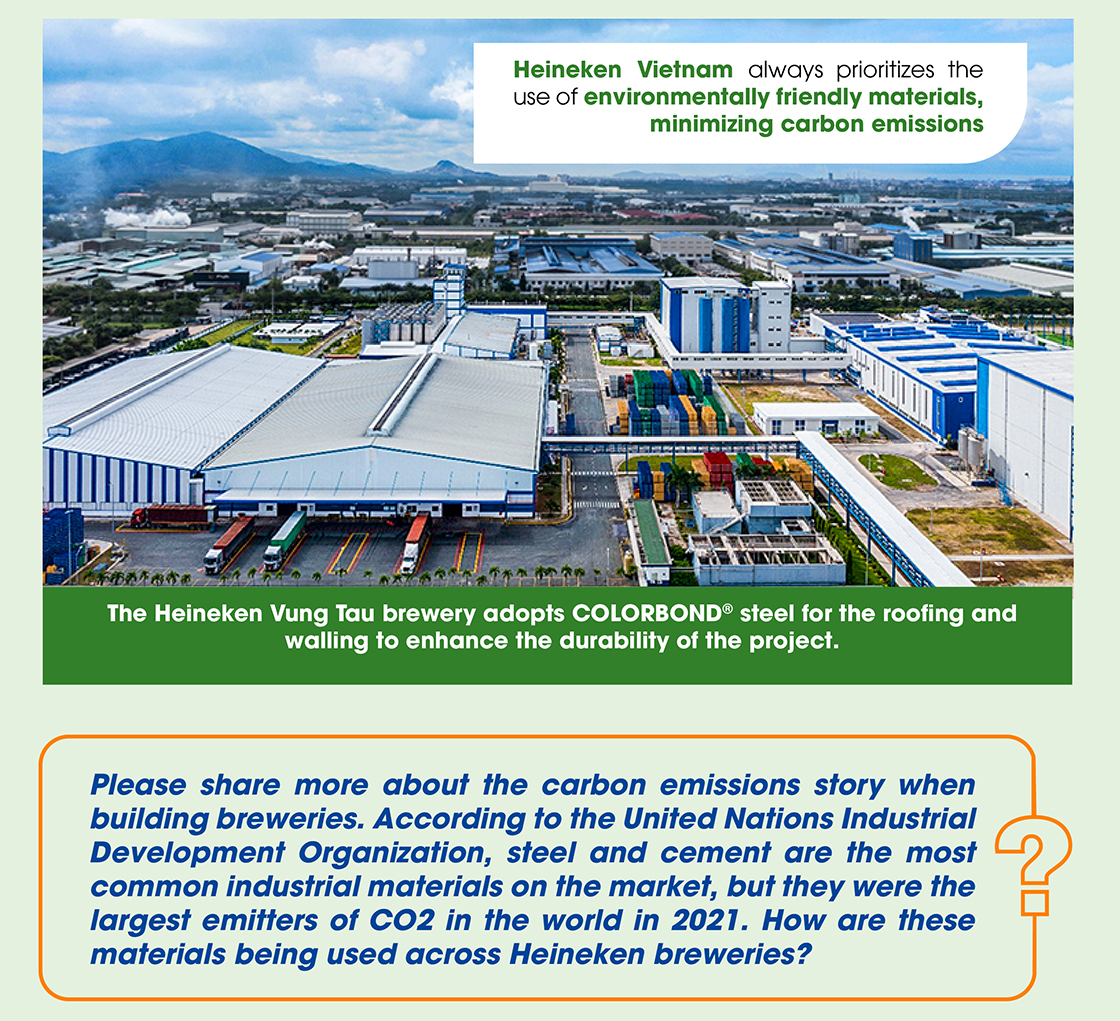 In an interview with NS BlueScope Vietnam, Mr. Nguyen Huu Hoang, Sustainability Manager at Heineken Vietnam, said that Heineken always relies on its carbon emissions reduction strategy for its brewery construction projects, from design to material selection. Priority is given to the use of sustainable materials to minimize maintenance throughout the lifecycle of the project over time.