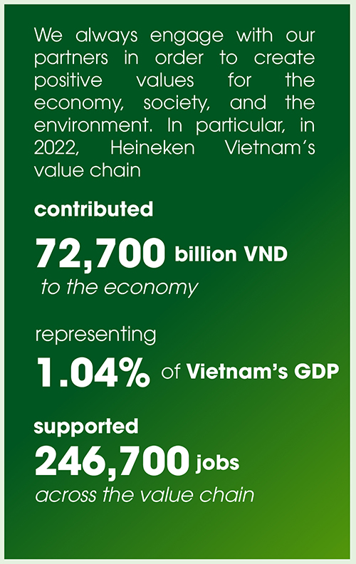 Indeed, sustainable development initiatives not only bring positive benefits to the environment but also to stakeholders engaged in these activities, such as suppliers and businesses. In particular, by adopting the circular economy model, 6/6 of Heineken Vietnam’s breweries have achieved the goal of sending zero waste to landfills, reusing and recycling 100% of their waste or by-products in production, making more efficient use of water and energy, and creating fewer emissions into the environment. Meanwhile, rice husks, sawdust, and agricultural and industrial by-products are turned into biomass fuel for use. This not only reduces carbon emissions but also generates more income for the local people and relevant stakeholders.
