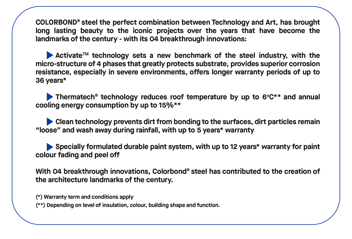 By using the COLORBOND® sheet to harmonize the aesthetic values and optimal work protection performance, the warship gallery – Australia Maritime Museum is promised to become a new historical symbol for sustainable beauty.