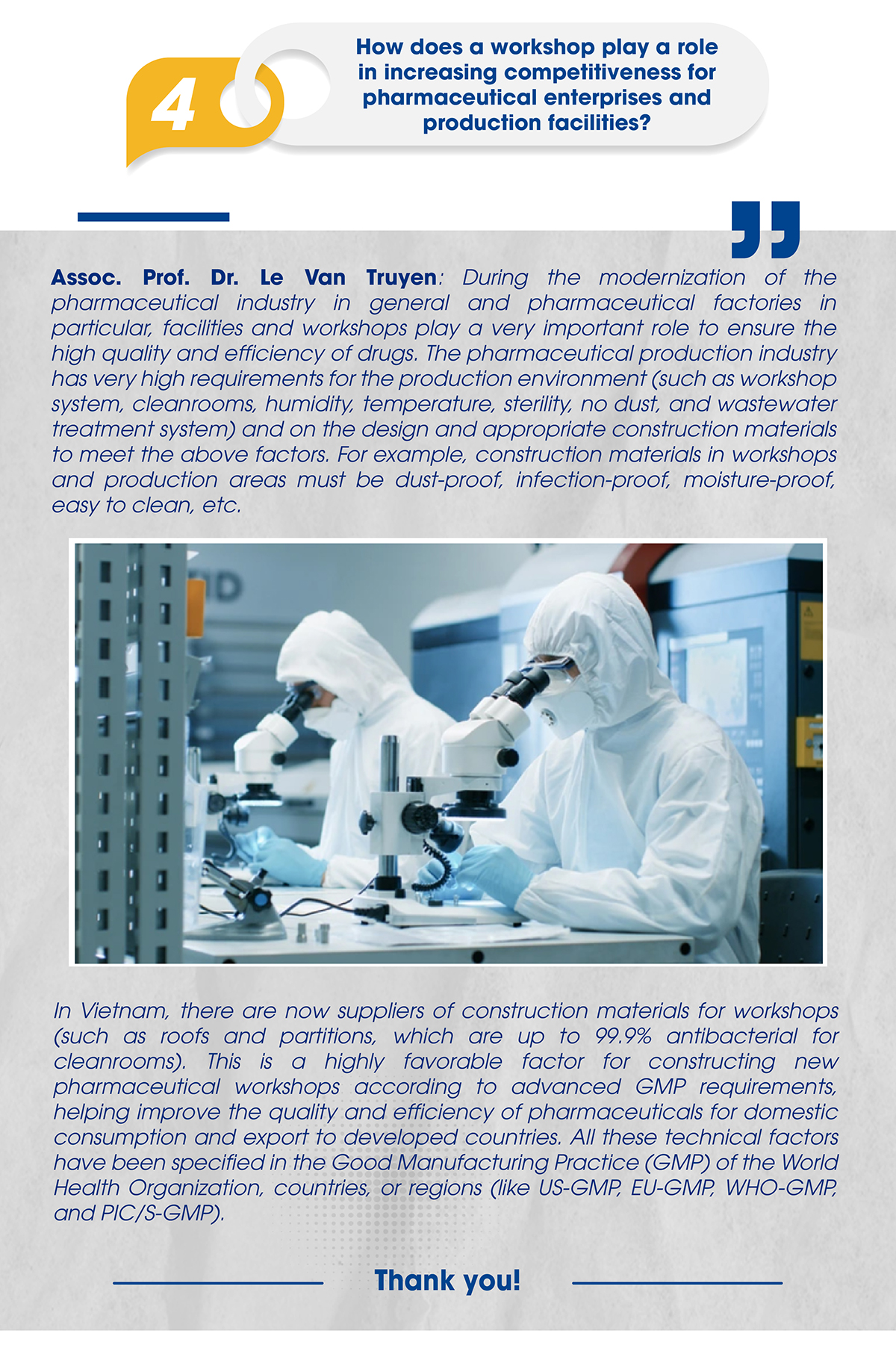 By the end of 2022, Vietnam had 228 pharmaceutical factories from 197 companies granted GMP certificates. However, the rate of factories achieving advanced GMP was still low (about 5%), partly because the workshop standards were not high. Therefore, the issue of investing in a workshop system with international standards (cleanrooms) is one of the factors that play an essential role in pharmaceutical factories achieving advanced GMP. This includes using products to construct advanced and modern workshops (such as steel for roofs and partitions) with up to 99.9% antibacterial technology.