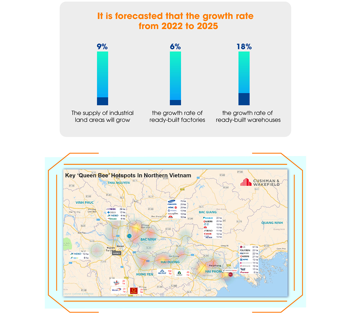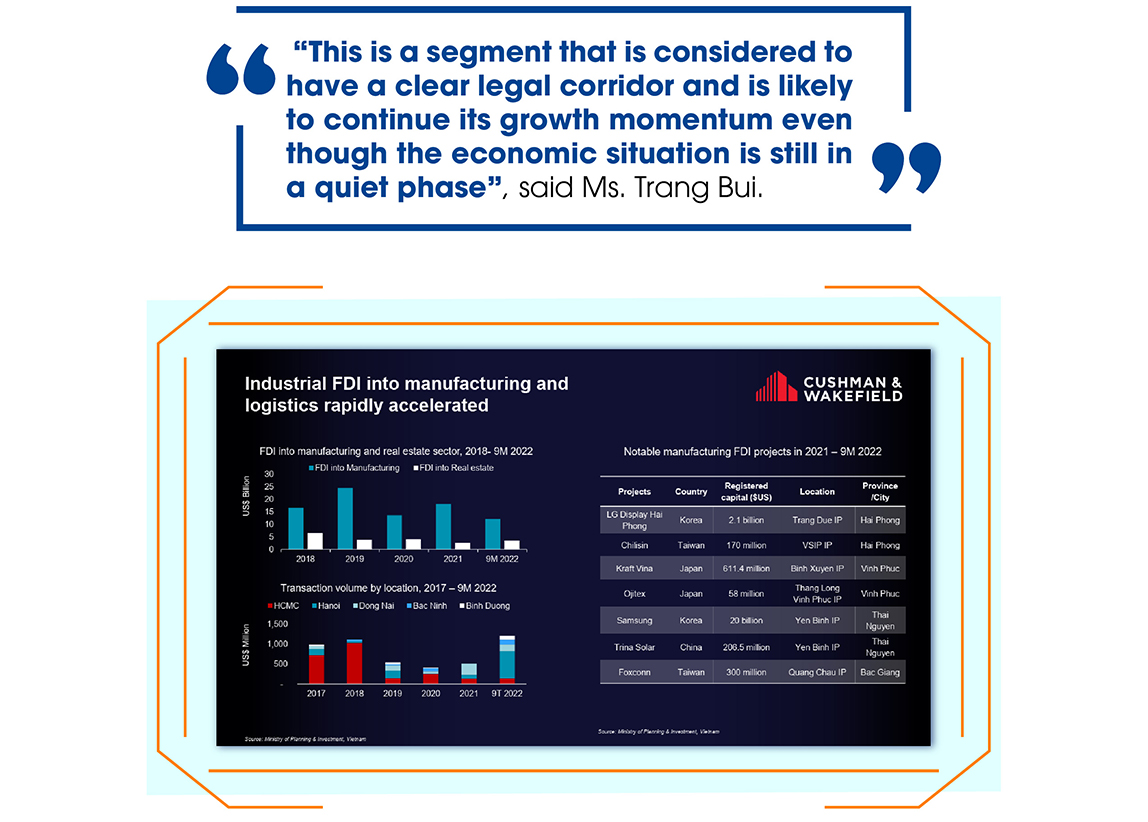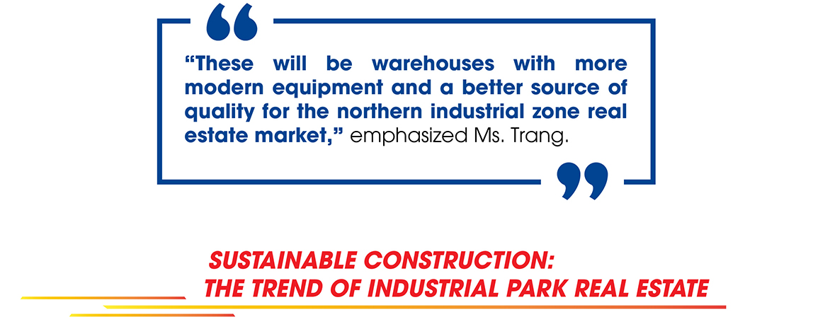 Foreign investment in real estate also has steady growth, with a gradual shift to the North starting in 2018. Many multinational corporations such as LG, Samsung, and Foxcom continue to commit to investing in this area. Assessing the real estate market of the Northern industrial zone, Ms. Trang Bui said: The North has an industrial park real estate supply of more than 13,000 hectares, of which the key is Bac Ninh and Hai Phong – the main supply for ready-built factories and ready-built warehouses.