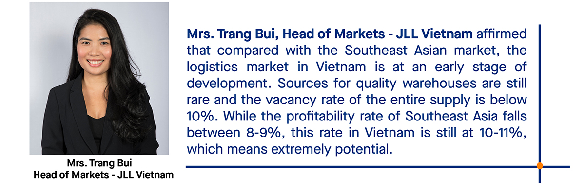 Therefore, what logistics companies need to do is to focus on improving the operational efficiency of their customers and optimizing the circulation of goods. “The land with a favorable location will not be available in the long term, so the trend is to develop high-rise warehouses to increase investment efficiency. Future warehouses, technology-integrated smart warehouses, and sustainable warehouses will be the trend in the industry in the coming period,” added Ms. Trang Bui.