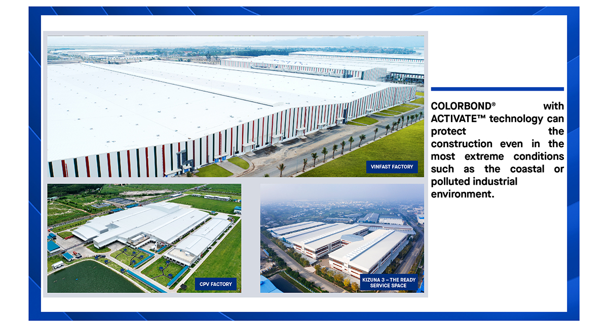“In terms of materials, we have COLORBOND® adopting ACTIVATE™ four-phase matrix technology totally different from the conventional cold sheet. In addition to the corrosion resistance of ACTIVATE™ technology, COLORBOND® also is integrated with heat radiation to make the roof material up to 6 degrees cooler than the outdoor temperature; Clean technology to fight against the tropical pollution of Vietnam’s climate,” Mr. Vo Minh Nhut shared about NS BlueScope Vietnam’s solutions.