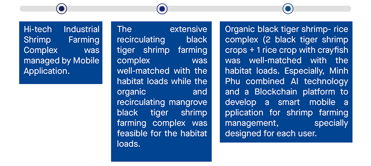 Minh Phu has launched R&D and successfully piloted the 2-N-4 high technology shrimp farming model for many years. Then, it was effectively put into operation in two 900-ha farming areas; cooperation with some Vietnamese and foreign research institutes has been also enhanced to modernize shrimp farming technology.