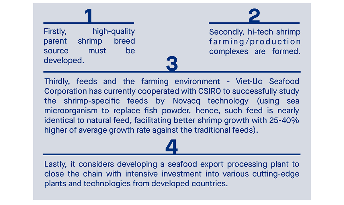 Mr. Nguyen Cong Can – Deputy General Director in charge of Techniques of Viet-Uc Seafood Corporation shared, to launch a close value string from parent shrimp, breed, feed, and commercial shrimp to processing, and each segment must be applied with outstanding technologies.