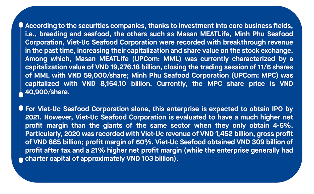 Like Thuan Phuoc, Minh Phu Seafood Corporation expected that Minh Phat Seafood Processing Plant shall be constructed in Q2/2021, located at Khanh An Industrial Park (Ca Mau), injected with investment capital of VND 1,000 billion. Minh Phu is also known with 10-member companies, including 4 shrimp processing plants and 8 Group companies. Each member is a critical chain in the entire shrimp production value string of Minh Phu.