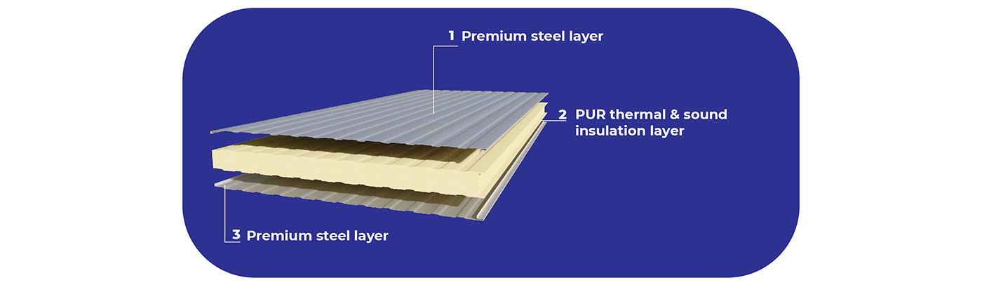 Sandwich panel is an insulating PUR panel, consisting of 3 layers, in which layer 1 and layer 3 are high-grade galvanized steel, layer 2 in the middle is soundproof and heat-insulating.