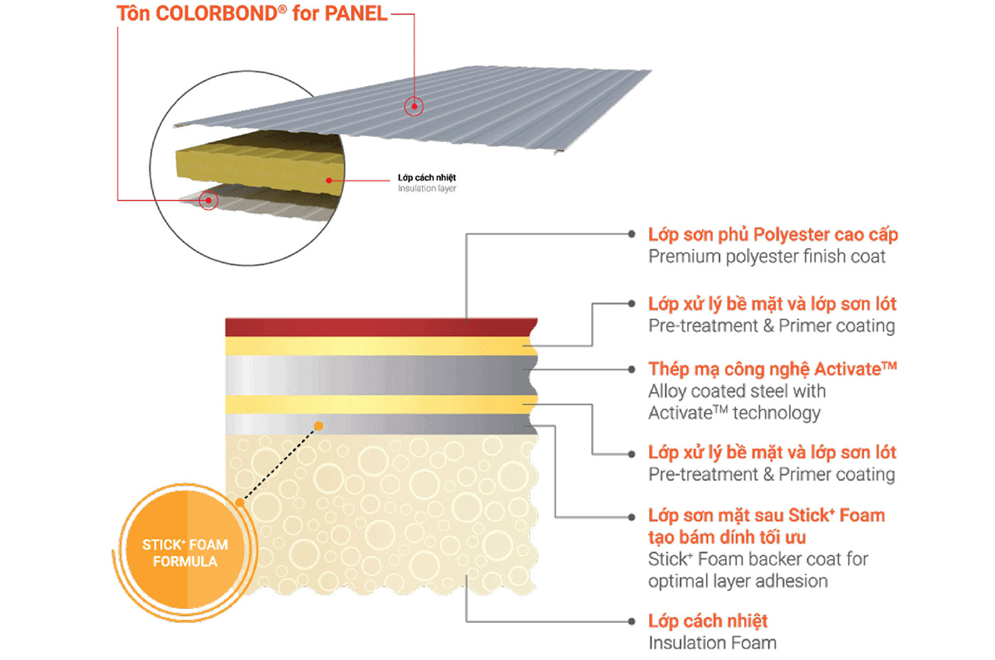In addition, this material is integrated with advanced technologies such as: Stick + foam to enhance optimum adhesion of the steel substrate layer to the insulation surface; durable polyester paint system, resistant to fading and peeling; and especially Activate ™ technology, known for its four-phased matrix protection for the steel substrate, completely different from the traditional Al-Zn alloy coating, providing superior corrosion resistance, even in severe environments (marine and polluted industrial sites). COLORBOND® For Panel thereby contributes to the