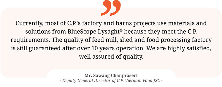 “If you want to raise good livestock, good product, you need a high-quality feed mill, shed and food processing factory”. Shed and food processing factory must use high-quality materials, design solutions to construction must meet the requirements of C.P., provided by reputable corporation meeting qualified international.