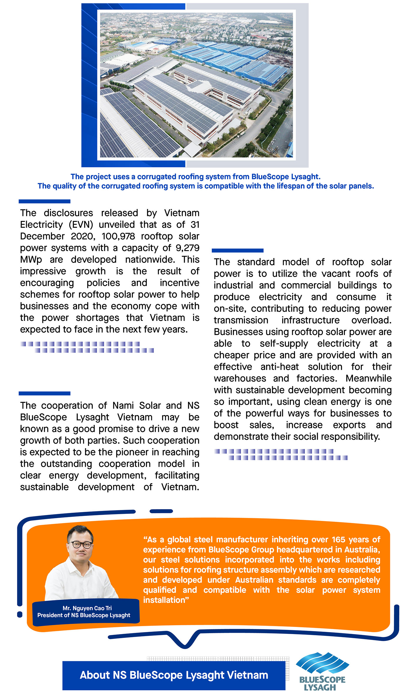 Being one of the first foreign investors in 1993, NS BlueScope Lysaght created a breakthrough in the Vietnam construction industry through launching innovative and high-tech steel buildings products & solutions. Especially, the roof sheet system solutions are compatible with the solar power systems, supported by wind uplift capacity, water-proof features, are tested and synchronized from design to installation, facilitating the investment efficiency, offering sustainable quality to all works.