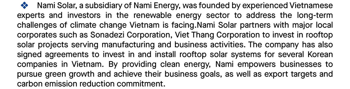 challenges of climate change Vietnam is facing.Nami Solar partners with major local corporates such as Sonadezi Corporation, Viet Thang Corporation to invest in rooftop solar projects serving manufacturing and business activities. The company has also signed agreements to invest in and install rooftop solar systems for several Korean companies in Vietnam. By providing clean energy, Nami empowers businesses to pursue green growth and achieve their business goals, as well as export targets and carbon emission reduction commitment.