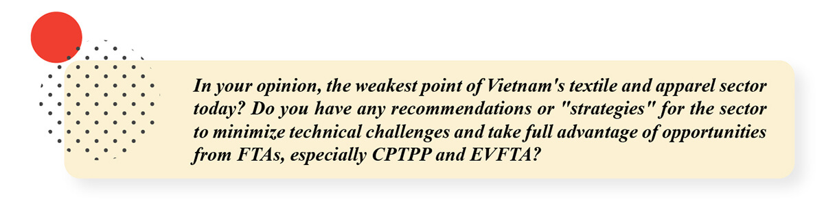 According to most of assessments from experts and the press, the weakness of textile and apparel enterprises is that they cannot take initiative in input materials, because they have to import from foreign countries, not being members of FTA, they will not enjoy preferential tariffs. From a personal perspective, I think it also lies at the integrity of supply chain connectivity in the sector.