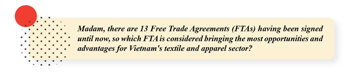 It is difficult to say which FTA brings the most opportunities and advantages for Vietnam’s textile and apparel sector, because of taking the full advantages of FTA depend on the competence and capability to meet of enterprises for the regulations in each FTA, the competence to self-control in supply or in other words, the value of the supply chain, and technology ownership of the enterprise.