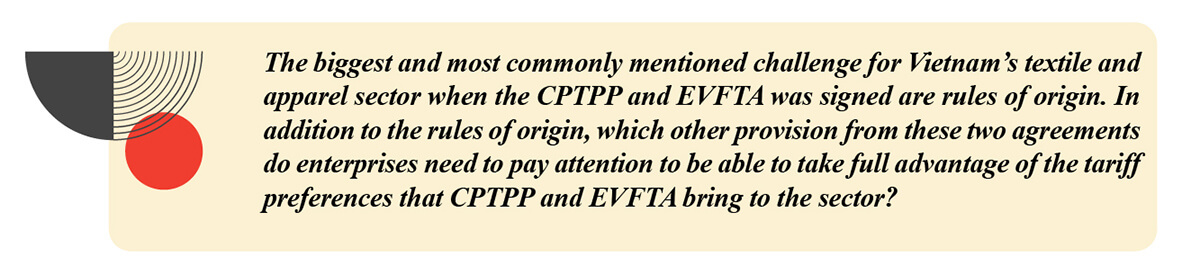Secondly, the rules of origin from fabric onwards are more flexible in EVFTA, compared to CPTPP from yarn onwards. According to the CPTPP, from yarn production, the stage from producing yarn to rough fabric to have finished fabrics to have finished garments must take place within the scope of the agreement, this is a difficult stage and currently there is no Members of the Agreement can perform well, so one or more third parties need to process/ produce one/ several stages in the chain and do not enjoy preferential treatment from CPTPP due to this economy/ country that are not party to the agreement. At this point, the rule of origin from fabric onwards is a flexible point in EVFTA compared to CPTPP.