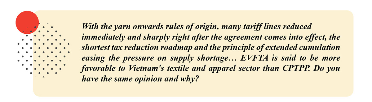 I agree with this point of view. Firstly, EVFTA is more favorable than the CPTPP in terms of the third party cumulation. Specifically, it is allowed for an economy to have FTA with Vietnam and EU at the same time, Vietnam can combine the input materials from this economy when exporting to the EU to enjoy preferential treatment under EVFTA. For example, Korea and Singapore are two economies that have FTA with Vietnam (ASEAN) and FTA with EU, Vietnam can combine fabric originating from these two countries, when exporting to the EU, they will enjoy preferential treatment under EVFTA, although Singapore and South Korea are not members of EVFTA. This is at least an advantage compared to the CPTPP, because the CPTPP does not allow cumulation from any non-member countries. However, the combined reality from these two countries is very limited due to the low content of imported raw materials from Singapore and Korea.