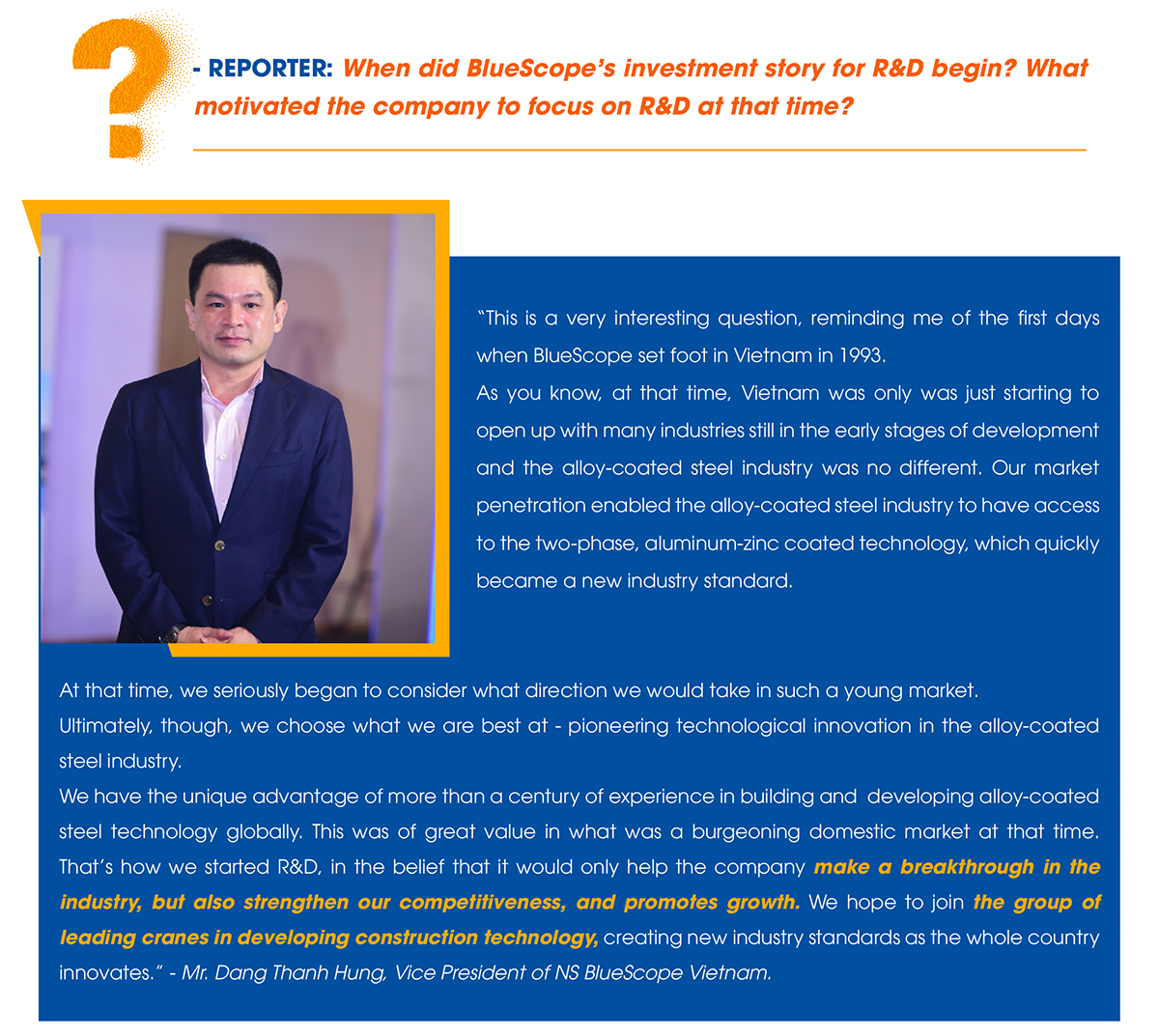 Mr. Dang Thanh Hung: When it comes to R&D, we talk about being at the forefront. Therefore, we must develop technology ahead of time and set new industry trends. That’s how BlueScope uses R&D as a competitive edge.