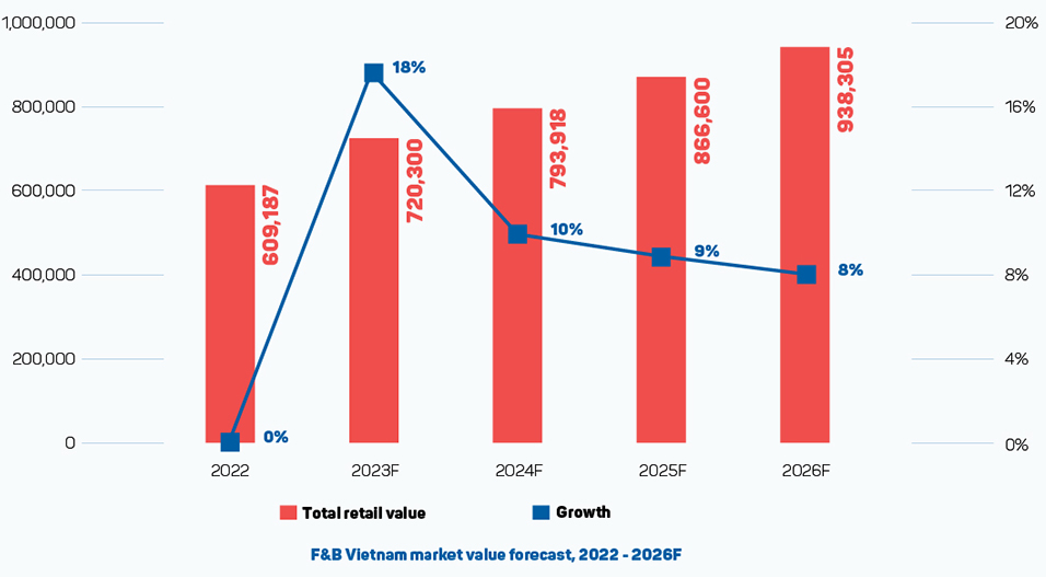 According to a Euromonitor study published in early 2023, the value of the F&B market in Vietnam was expected to increase by 18% in 2023 compared to 2022, reaching revenue of around 720.3 trillion VND.