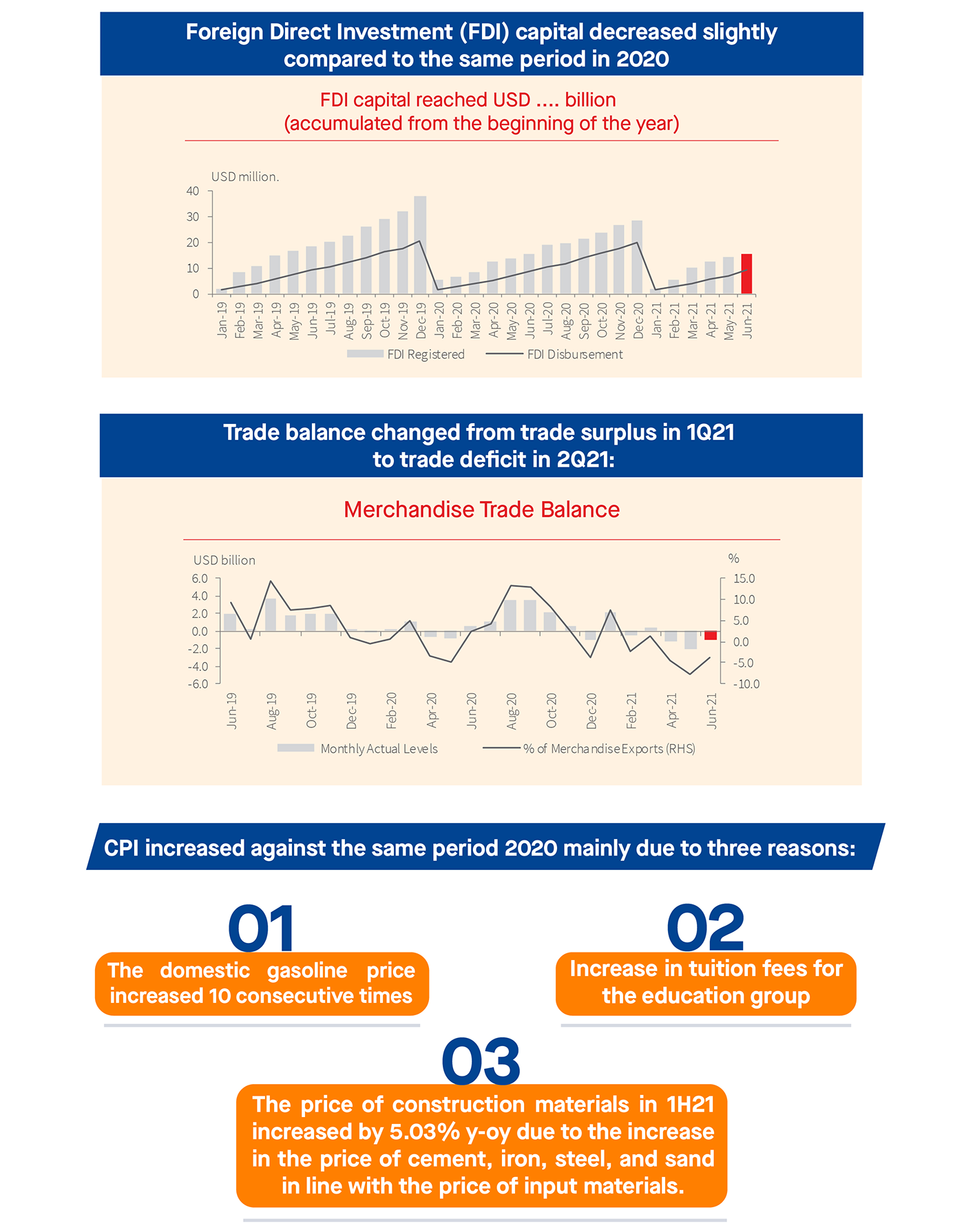 Vietnam continues to record a positive GDP growth in 2Q21: Vietnam’s GDP expanded 6.61% y-o-y in 2021, and this presented the 1H21 GDP’s growth rate at 5.64% y-o-y, higher than last year growth rate of 1.82%, yet lower than the rate of pre-Covid-19 years.